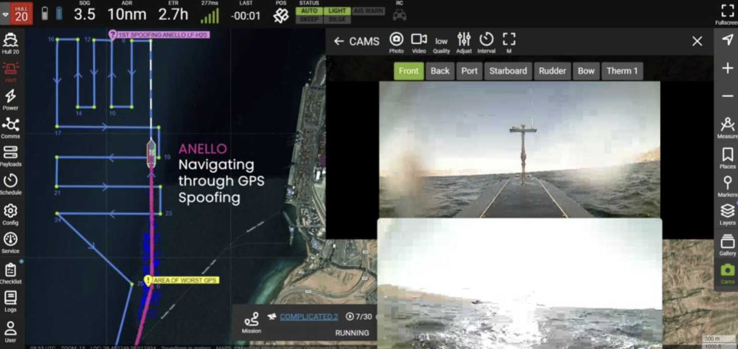 The example below shows the ANELLO Maritime INS maintaining stable navigation performance during real-world GNSS jamming and spoofing, demonstrating resilience in contested environments while enabling continued USV operations. Conducted in the Gulf of Aqaba, Jordan, this testing highlights the system’s ability to sustain reliable positioning and navigation performance despite GPS spoofing and signal degradation (Figure 2).